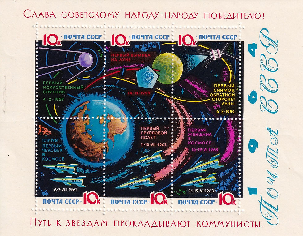 Two souvenir sheets issued on Aug 20, 1964 in two variations: regular paper (first) with print run of 800,000 pcs. and varnished paper (second) with print run of 200,000 pcs. The design has been done by so-called LESEGRY team of three artists: Boris Lebedev, Leonard Sergeev and Mark Grinberg (the team's name was a combination of first letters of respective last names). The artists started to work together in 1957 mostly focused on Soviet propaganda posters with Zenith and Plakat (Poster) publishing houses, and from 1961 were involved in the design of numerous space stamp issues.